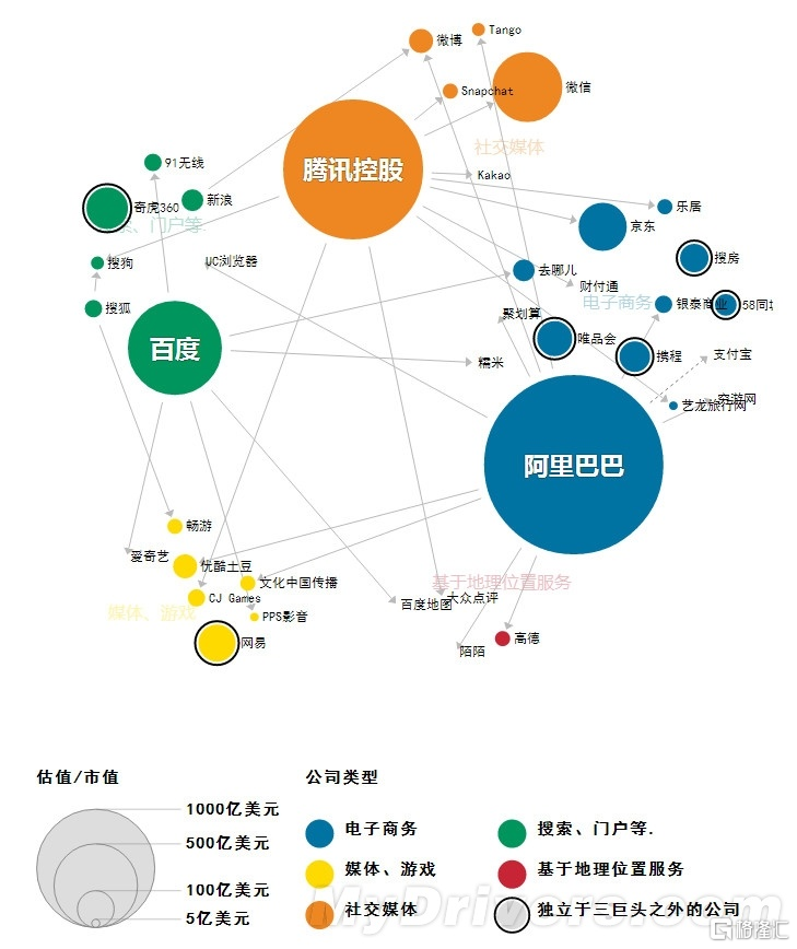 阿里则是收购为主,如优酷、UC、高德等,再将业务整合到自有业务生态。