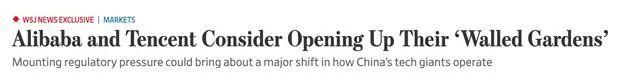 不知道是因为阿里和腾讯都是在美股上市还是别的什么原因,阿里巴巴和腾讯正考虑逐步互相开放生态系统的消息最先由外媒报道出来。
