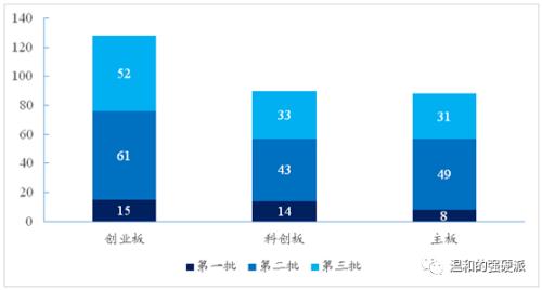 我们根据工信部三期“专精特新”小巨人名单与A股上市公司进行匹配,在未考虑公司并购重组、母子公司等特殊情况下,匹配得出306家已上市公司。专精特新小巨人企业在各批次中,主板、创业板和科创板分别有88、128 和 90 家,各批次上榜企业均为创业板>;科创板>;主板。