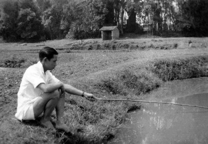 民国时期一处池塘边在钓鱼的青年,一丝不苟的发型加上手表,应该也是哪家公子了。