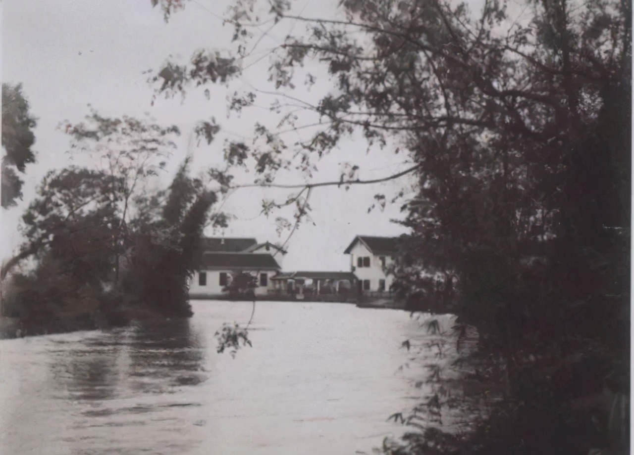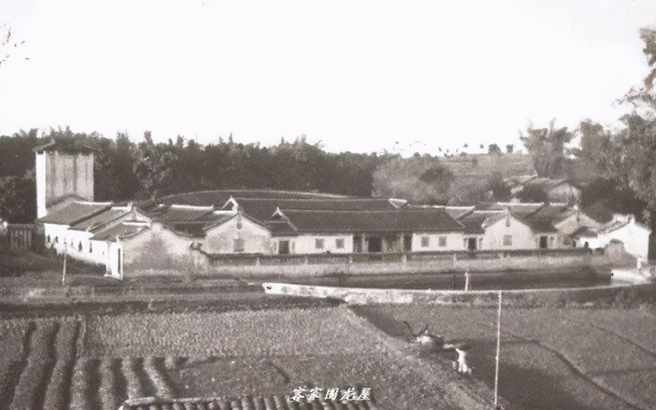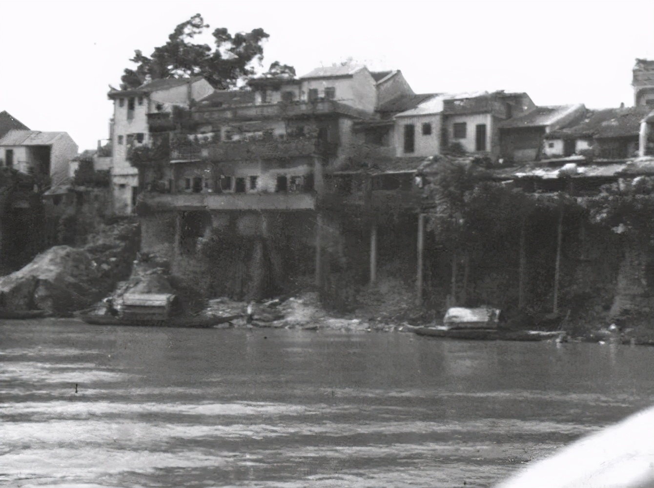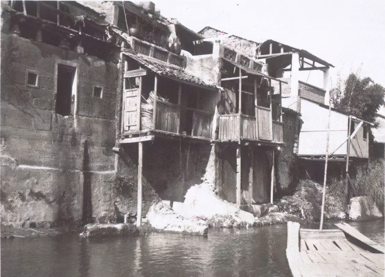 1936年梅江边的一处村落,沿江而建的吊脚楼,是那时候客家的典型民居建筑。