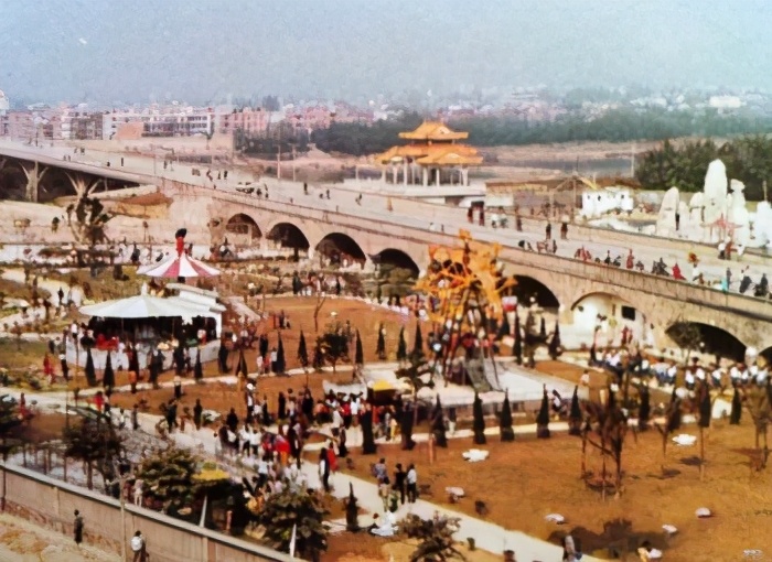 1986年的梅江桥人潮拥挤,是元宵东校场烧火龙队伍游行后的景象。