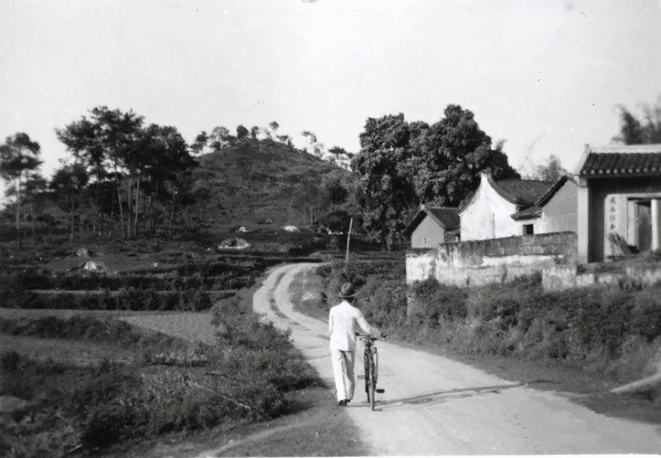 1936年梅县附近的马路,在当时已经十分宽敞了,两边还是农田,一位穿着白色西式服装的男人推着自行车走过,十分阔气。