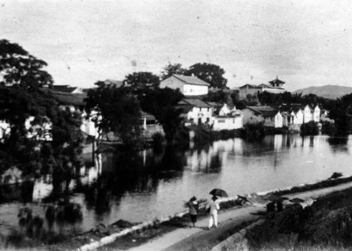 1930年的梅州城区景色,小桥流水人家,岸边还有人在撑伞漫步。
