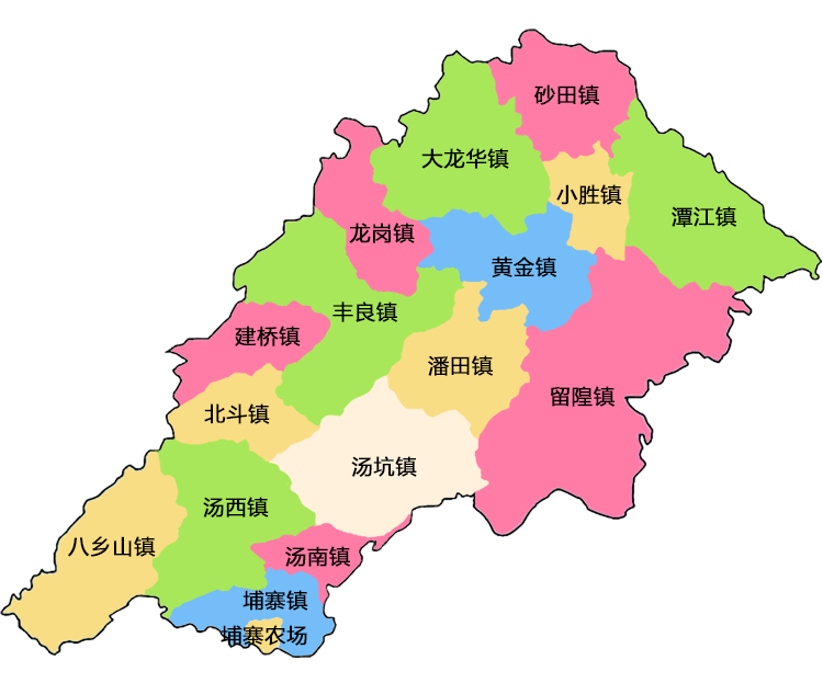 2004年10月,汤坑、附城、东联三镇合并为汤坑镇,留隍、东留、茶背三镇合并为留隍镇,大龙华、径门两镇合并为大龙华镇。全县设16镇、1场,下辖村委会261个(埔寨农场未计),社区居委会20个,自然村1956个。