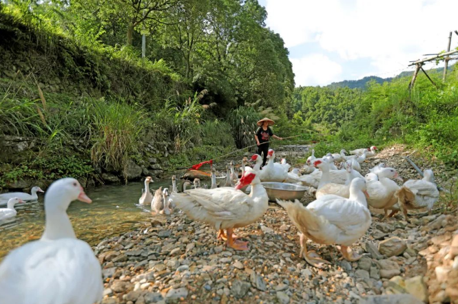 留隍农村家庭,通常会饲养一种“旱鸭子”。在池塘里不怎么欢,喜欢在房前屋后散步,大摇大摆不怕生,悠然自得。这种似鹅非鹅的家禽就是番鸭。番鸭是外来品种,享受着与番薯、番茄、番豆一样的冠名待遇,客家人称为“番鸭”。番鸭公体型肥硕,大的有10多斤;番鸭嫲体型小,匀称。黑毛、红鼻、颜值高,是传说中别人家的鸭子。